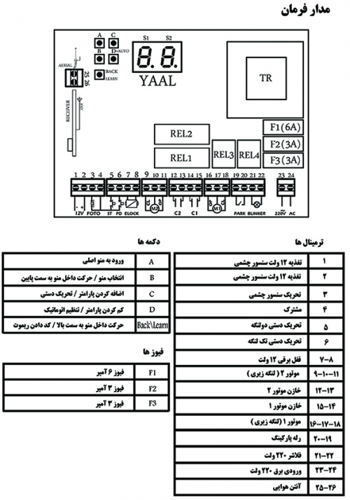 مدار فرمان دیجیتال برای موتورهای 220 ولت (AC)، برنامه ریزی جهت درب های تک لنگه و دو لنگه، برنامه ریزی مجزا هر لنگه برای دربهای نا متقارن، برنامه ریزی سریع زمان دربها، کددهی سریع ریموت، کددهی ریموت بصورت تک کانال و چهارکانال، سیستم هوشمند دور آهسته شروع و توقف، فرمان لحظه ای موتور جهت تست (هنگام نصب )، فرمان بستن اضطراری در هنگام باز بودن سنسور چشمی، خروجی قفل برقی - فلاشر - رله پارکینگ، تنظیم بسته شدن اتوماتیک بعد از زمان یا عبور از چشمی، ترمینال مجزا برای خازن موتور، ترمینال مجزا برای آنتن هوایی، تنظیم زمان درب عابررو، تنظیم فشاراولیه و نهایی جهت قفل برقی، ترمینالهای تحریک خارجی، تنظیم دور کند